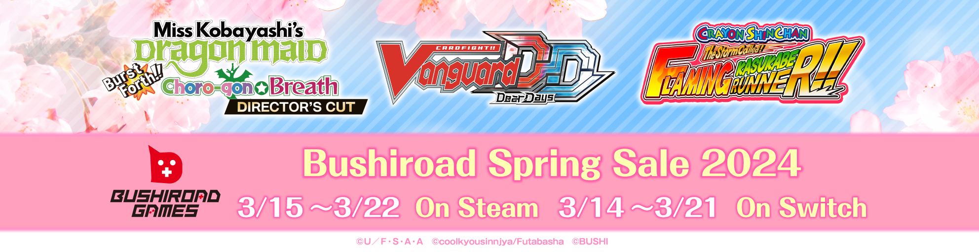 "BUSHIROAD GAMES Spring Sale 2024", a sale of console titles (digital version) by BUSHIROAD GAMES, will be held on the Steam Store and Nintendo eShop!