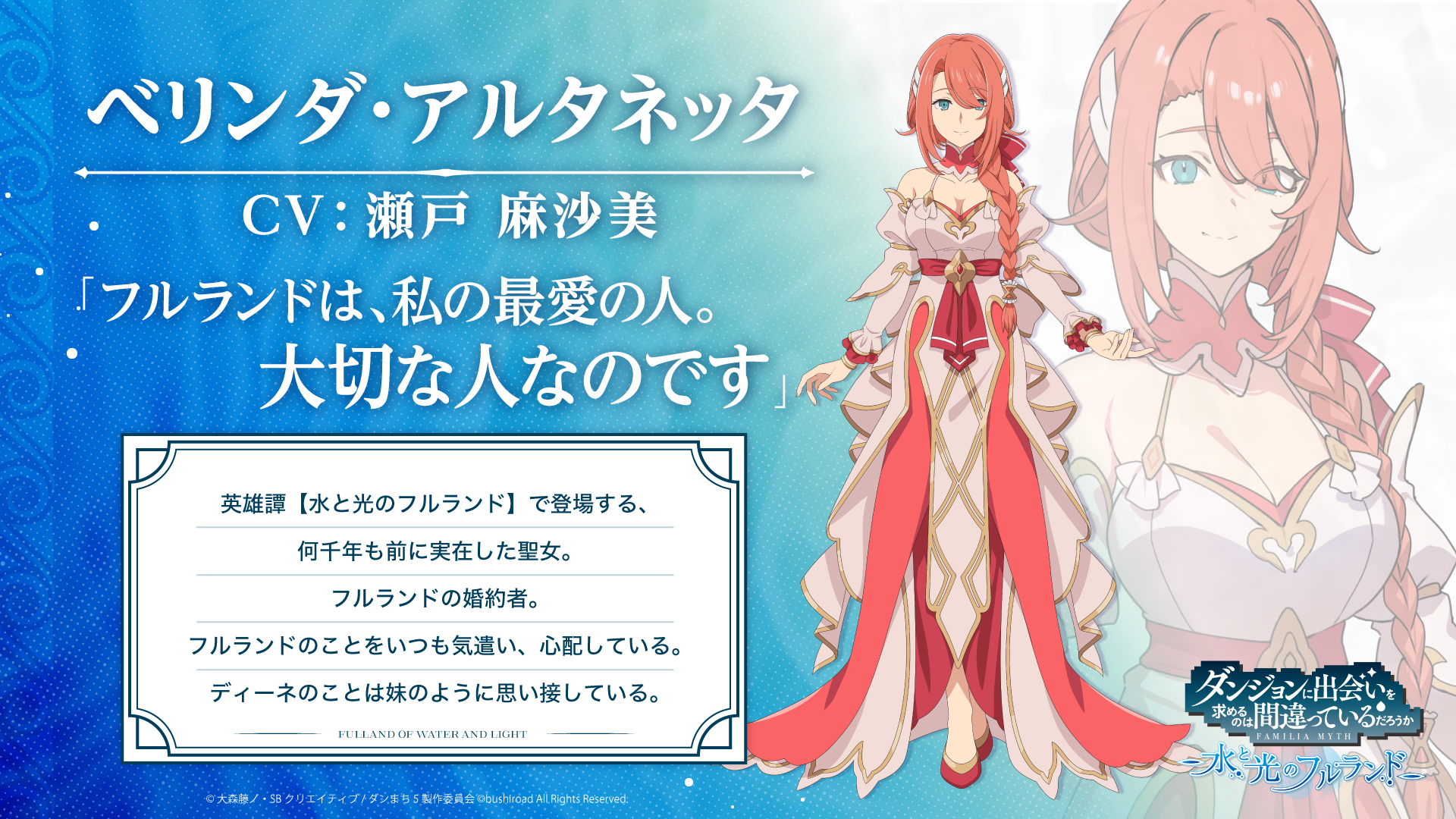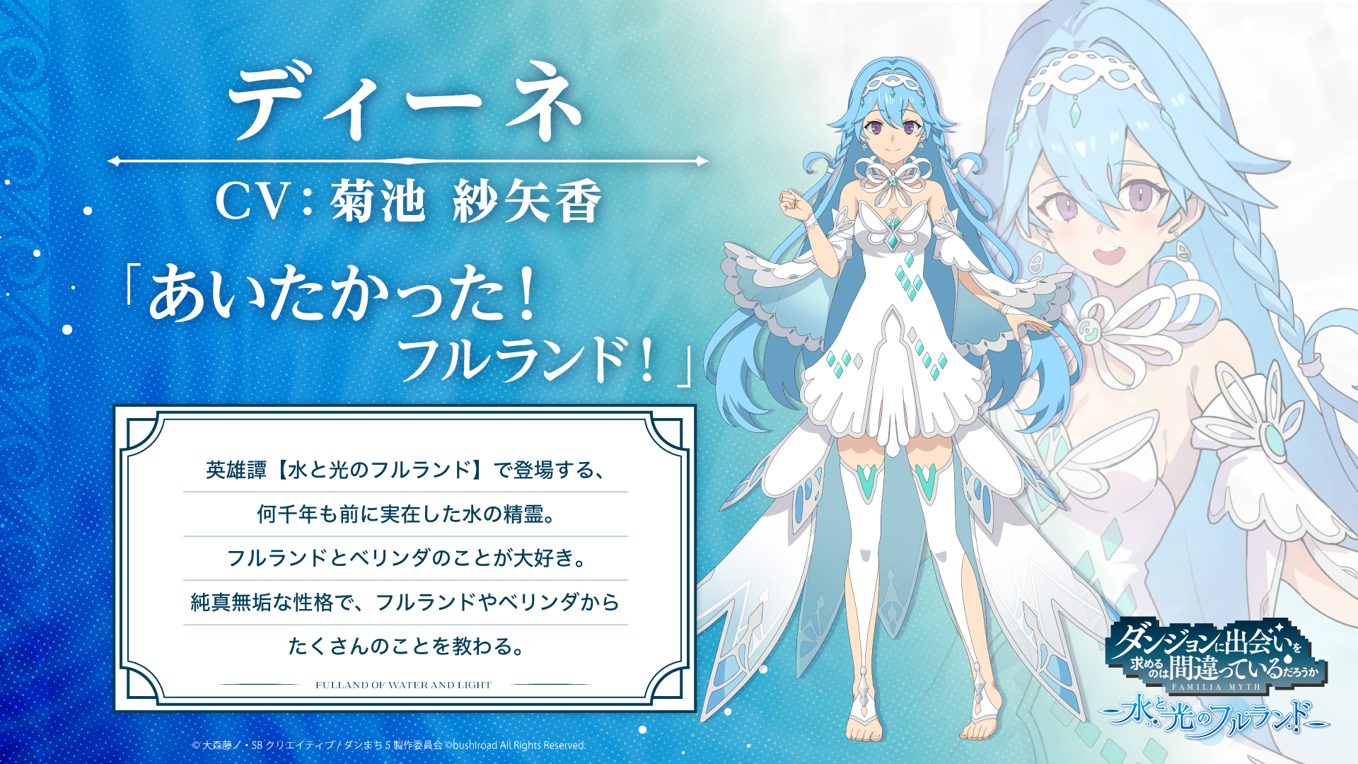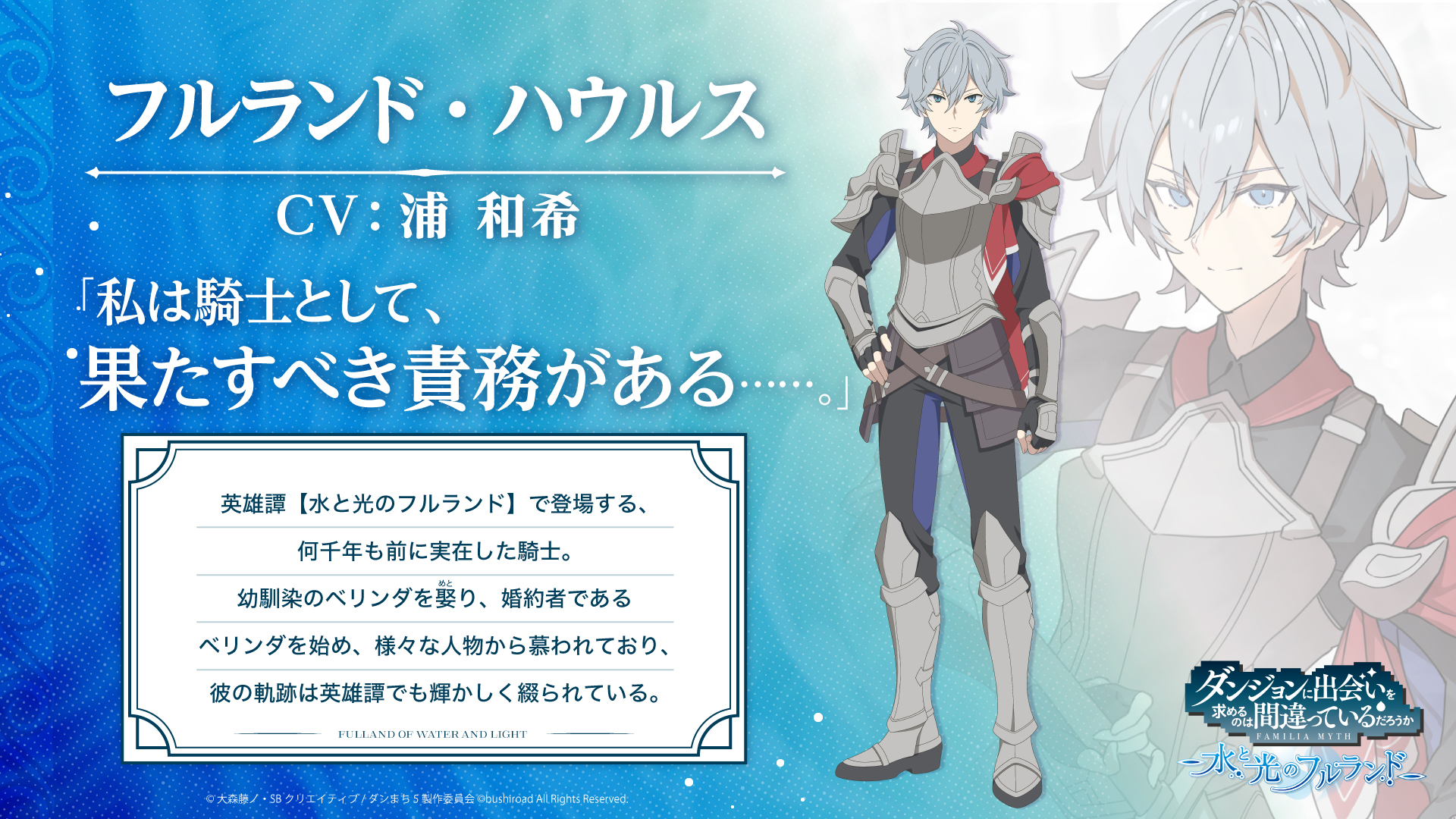 「ダンジョンに出会いを求めるのは間違っているだろうか 水と光のフルランド」には、原作小説で過去の英雄として描かれる騎士フルランドをはじめ、精霊ディーネ、聖女ベリンダの3人がオリジナルキャラクターとして登場します。