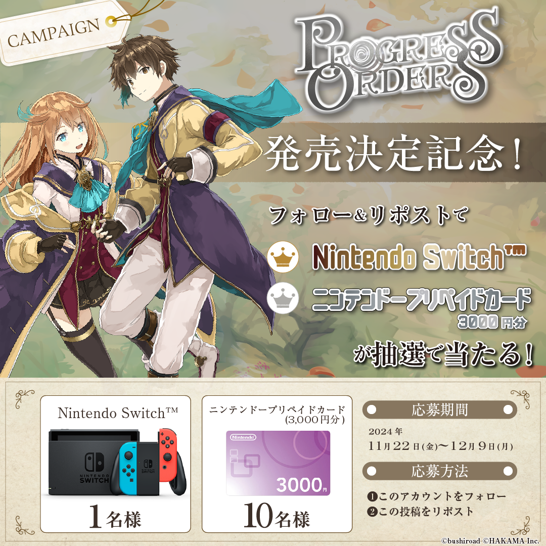 『PROGRESS ORDERS』の発売決定を記念して、現在、Nintendo Switch™やニンテンドープリペイドカードが抽選で当たるフォロー&リポストキャンペーンを開催中!応募期間は2024年12月9日(月)23:59まで。