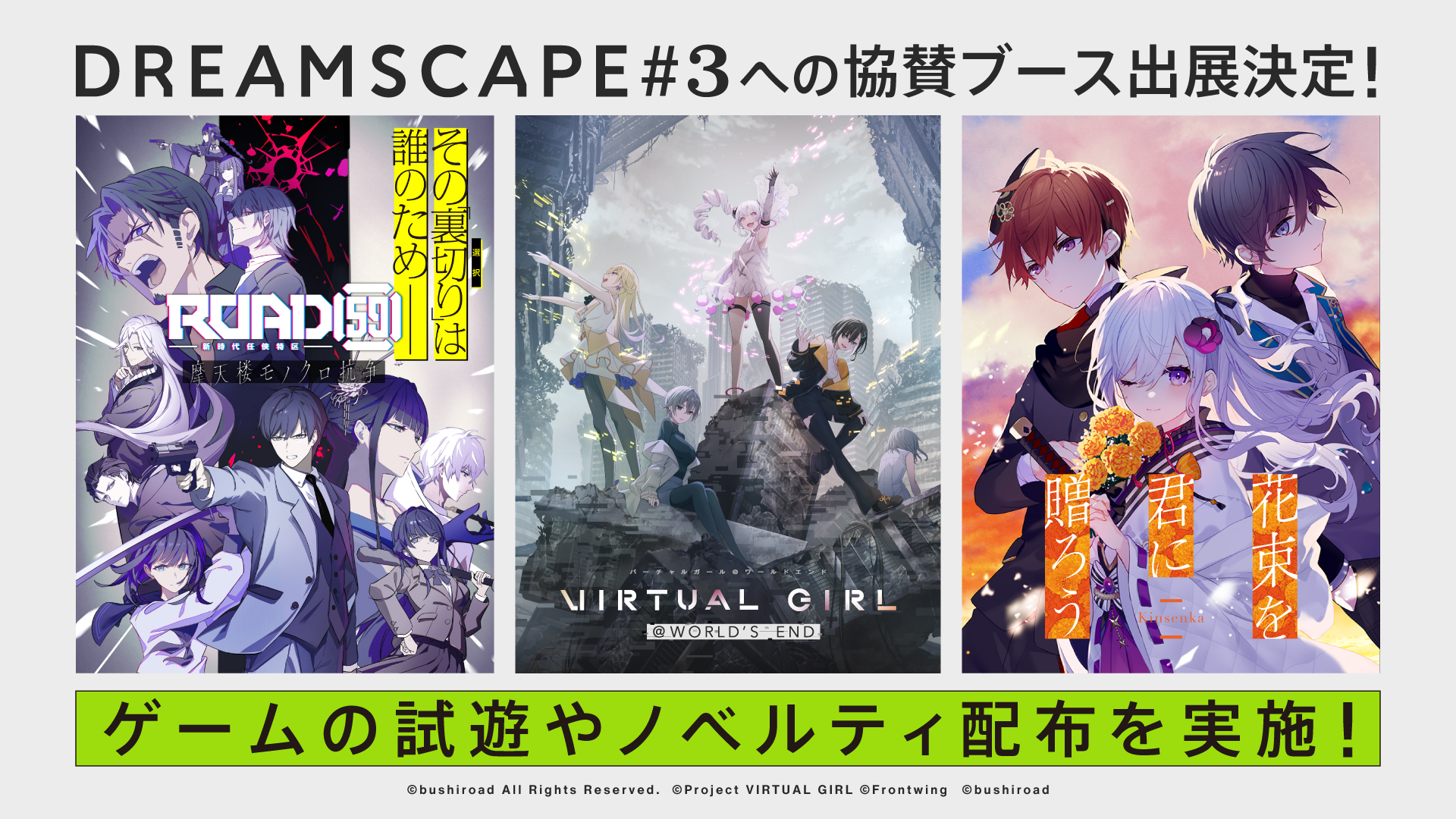 ビジュアルノベルゲーム「VIRTUAL GIRL @ WORLD‘S END」と「ROAD59 -新時代任侠特区- 摩天楼モノクロ抗争」の内容を紹介する小冊子を『DREAMSCAPE #3』ブシロードゲームズ協賛ブースにて無料配布します!