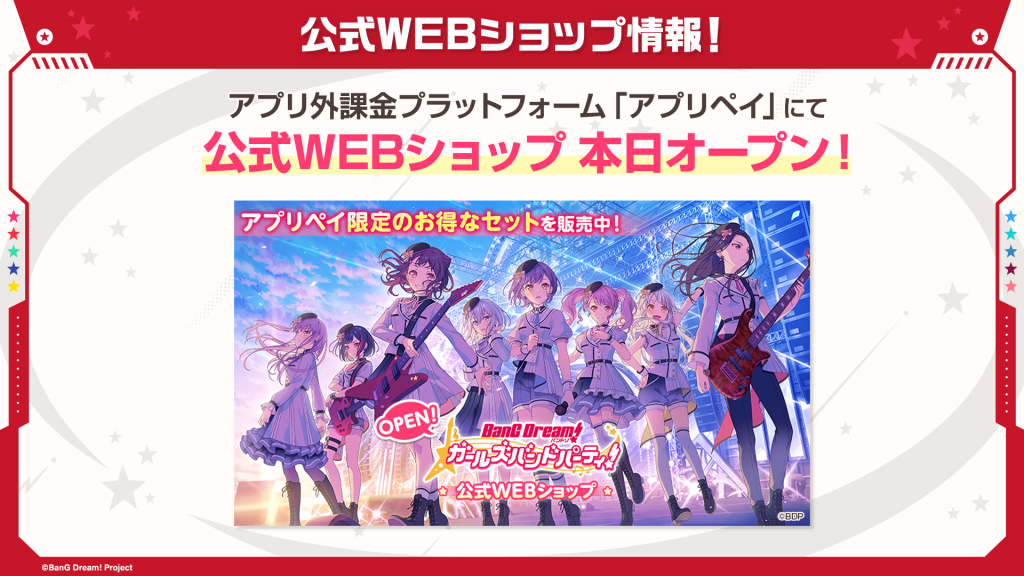 『バンドリ! ガールズバンドパーティー!』アプリ外課金プラットフォーム「アプリペイ」にて公式WEBショップオープン!